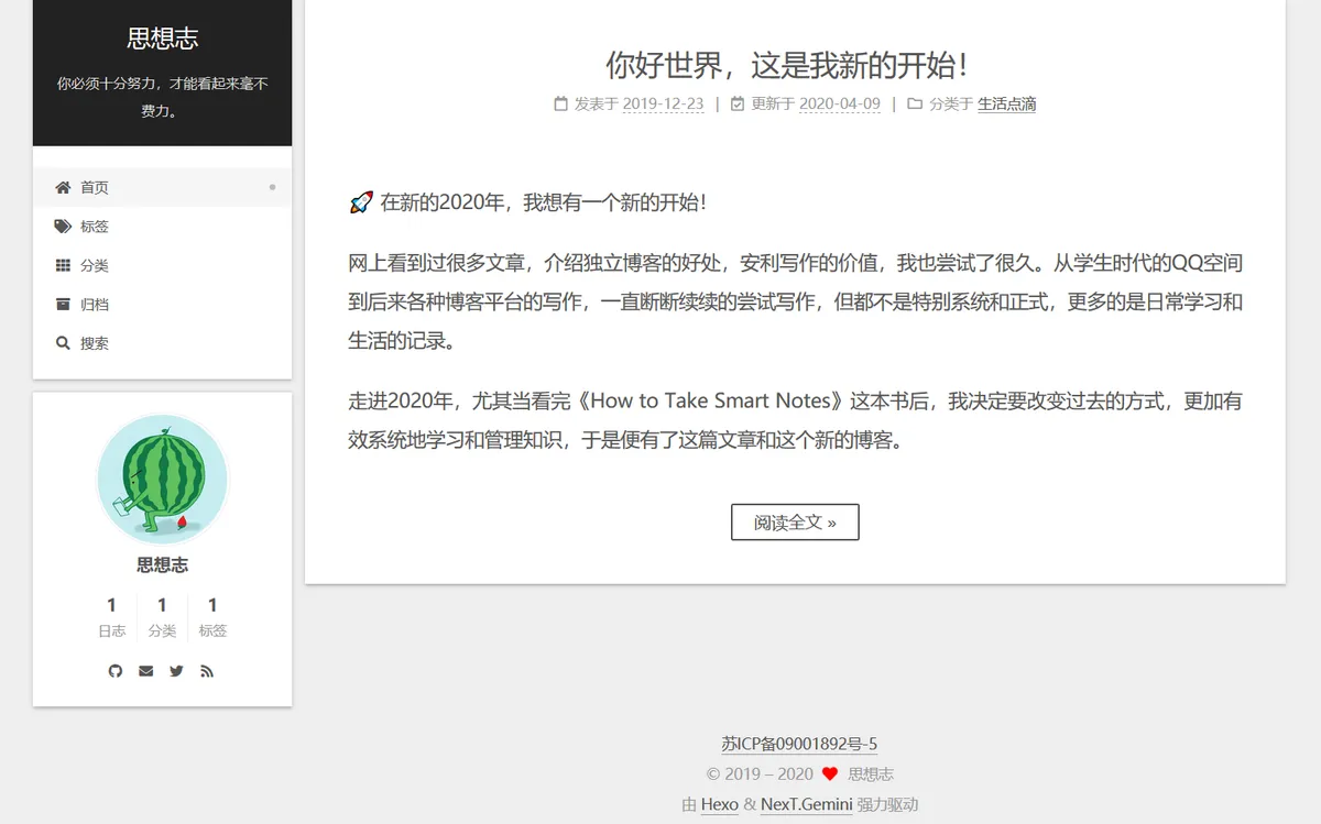 新的博客叫思想志,寓意为“思与想的日志”,使用Hexo静态网站生成器配合Next主题搭建,日后作为自己知识管理的出口,以教促学。新博客也将是督促自己成长的一个平台。